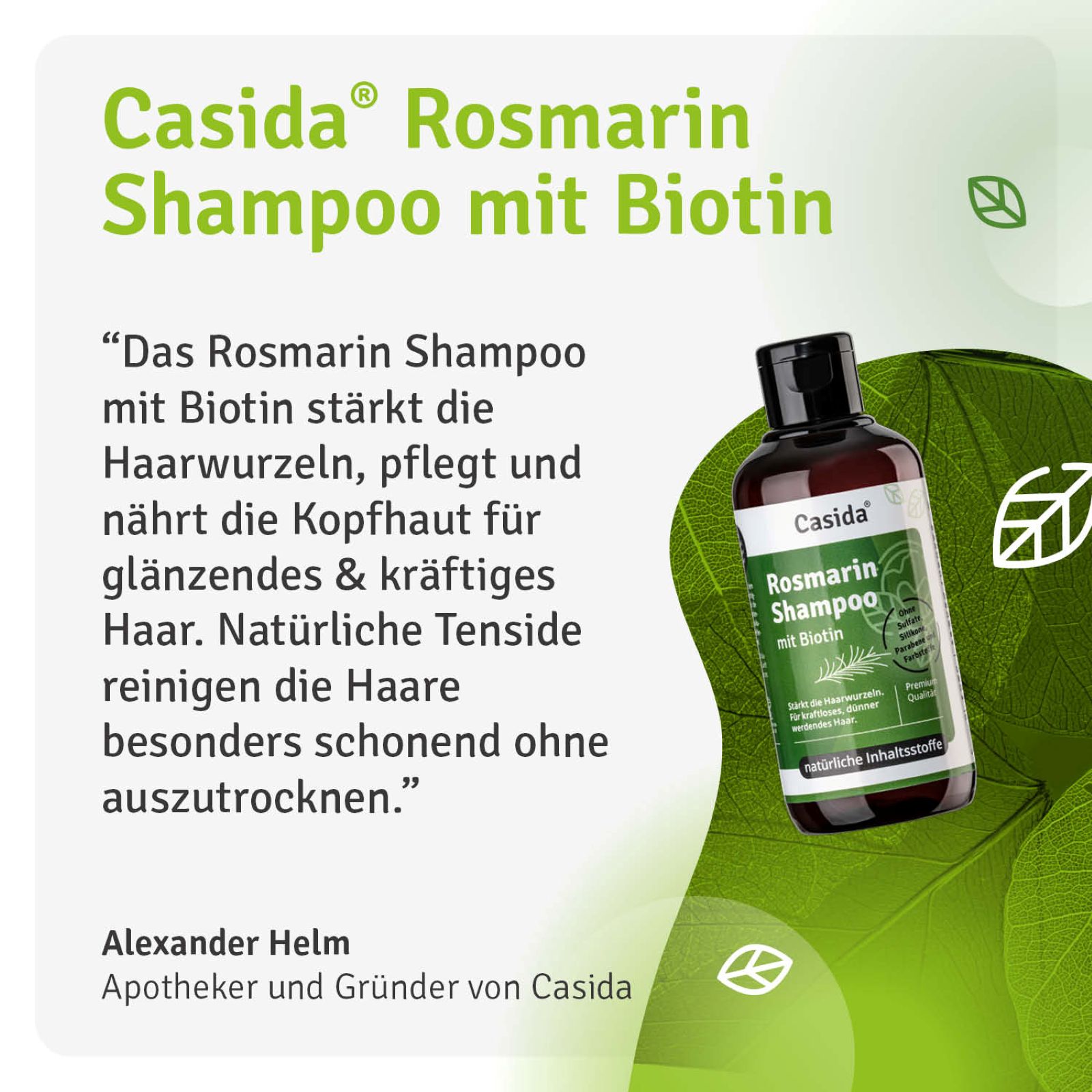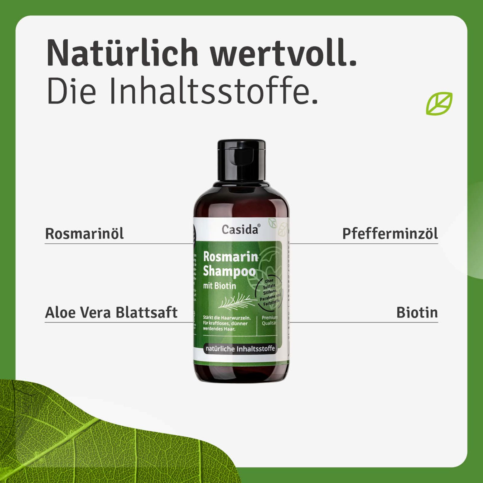 Schönes und geschmeidiges Haar ist ein Sinnbild für Jugendlichkeit und Vitalität. Das Rosmarin Shampoo mit Biotin stärkt die Haarwurzeln, pflegt und nährt die Kopfhaut und enthält rein natürliche Inhaltsstoffe ohne umstrittene Stoffe wie Silikone, Sulfate, Parabene, Farbstoffe oder Mikroplastik.