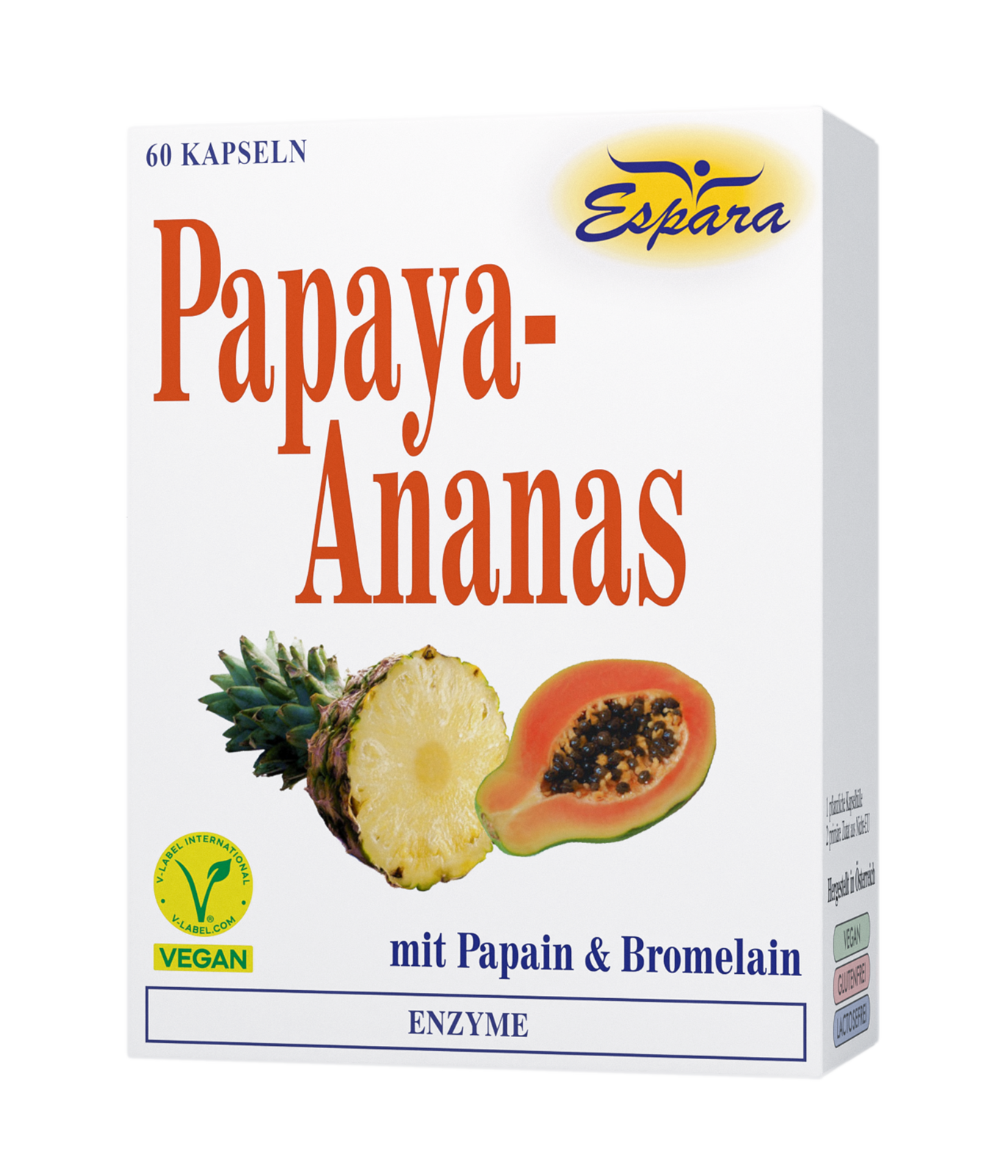 Tagesdosis (3 Kapseln) entspricht: 900 mg Papayafrucht-Pulver, 30 mg Papain, 30 mg Bromelain.