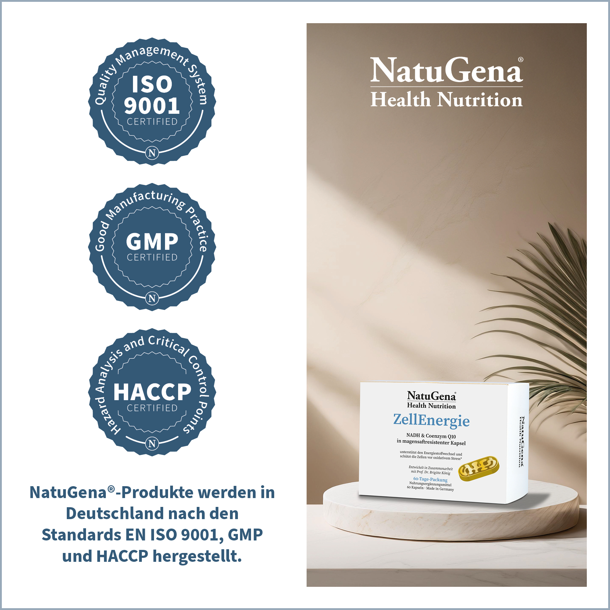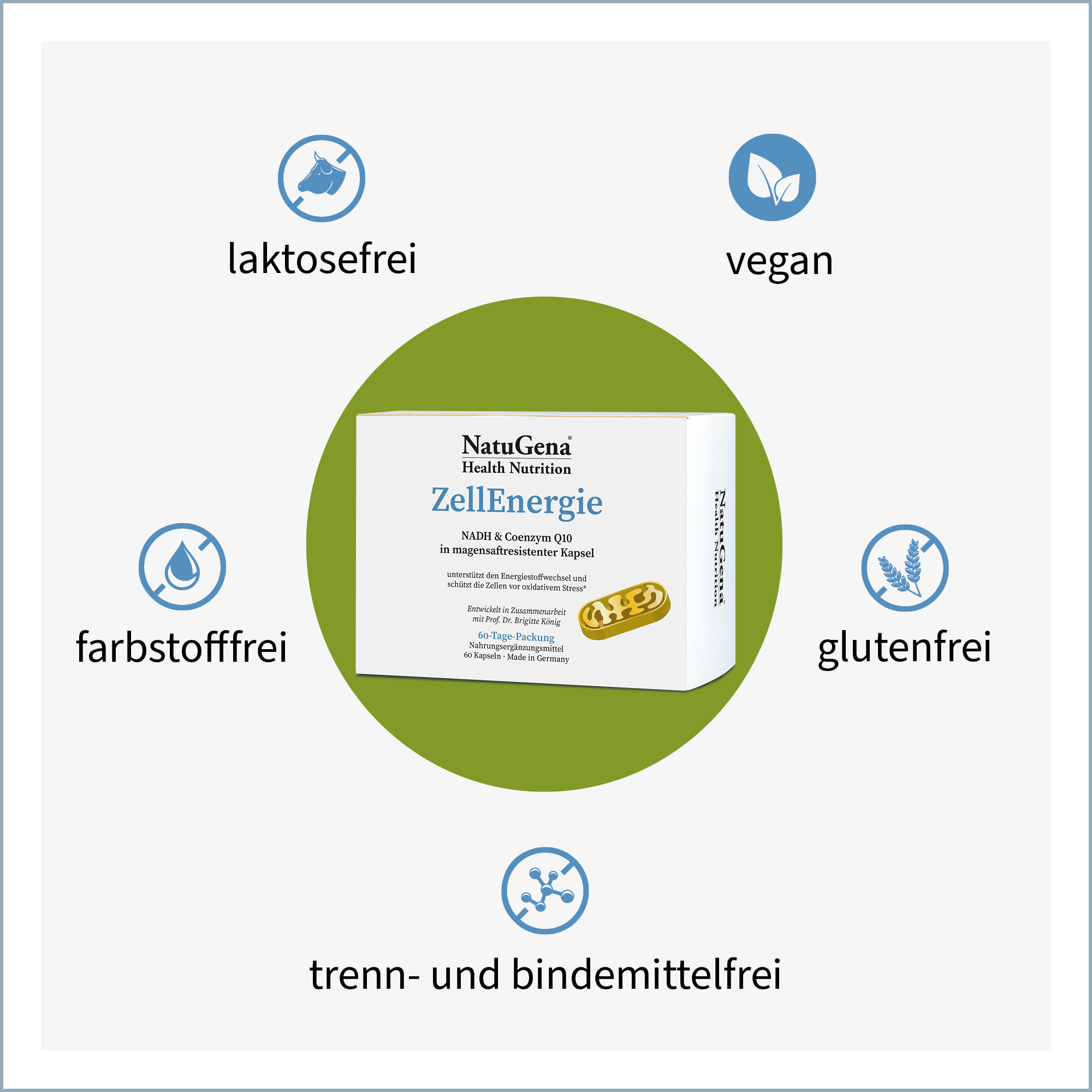 In NatuGena ZellEnergie vereinen sich wertvolle Mikronährstoffe wie NADH, Coenzym Q10, R-Alpha-Liponsäure und trans-Resveratrol aus Knöterich-Extrakt zu einer durchdachten Kombination. Ergänzt wird die Rezeptur durch bioaktive B-Vitamine, darunter Thiamin, Riboflavin und Niacin.