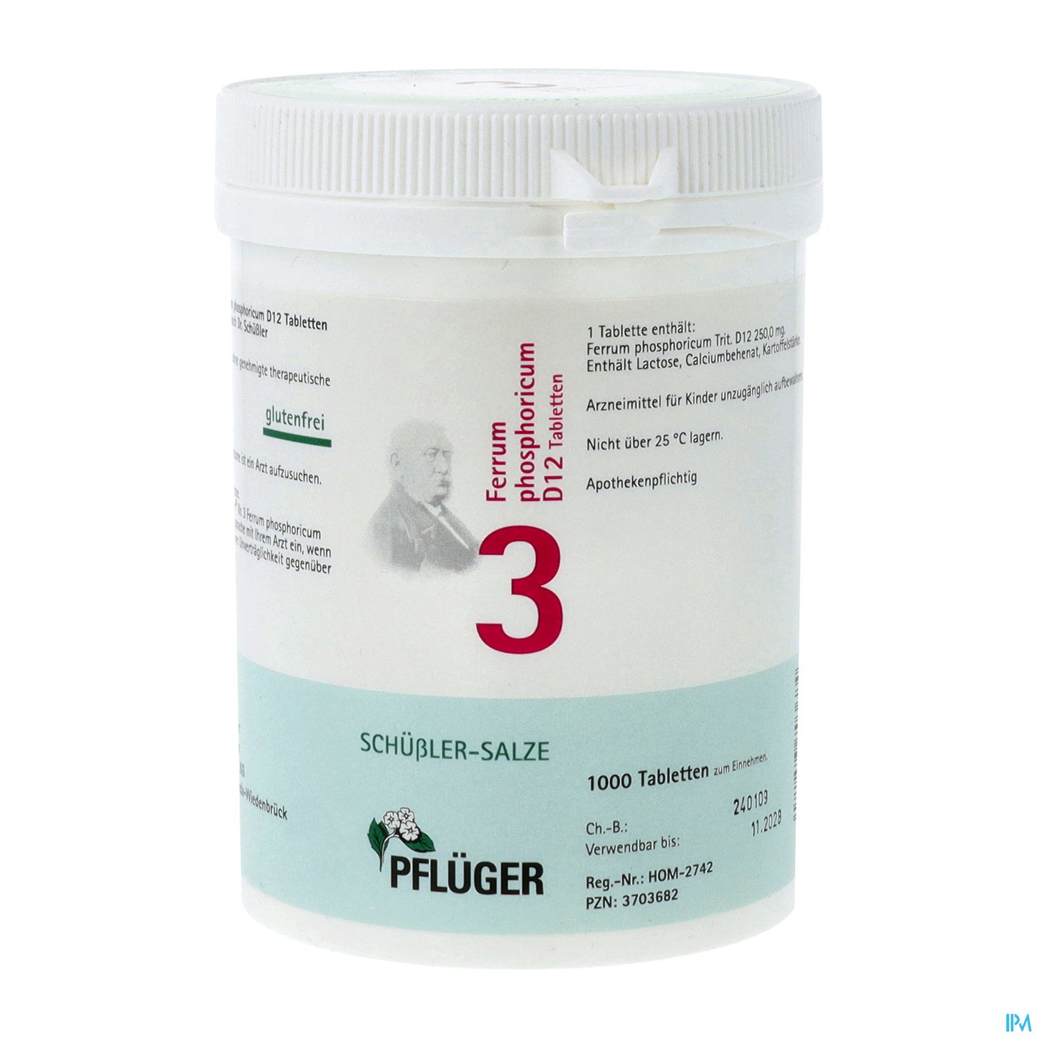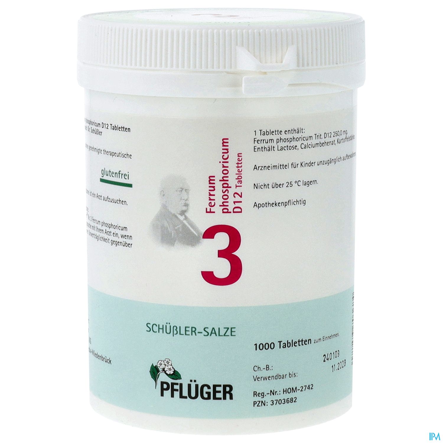 Biochemie Pflüger® Nr. 3 Ferrum phosphoricum D12, Zusammensetzung: 1 Tablette enthält: Wirkstoff: Ferrum phosphoricum Trit. D12 250 mg. Sonstige Bestandteile: Calciumbehenat (DAB), Kartoffelstärke.