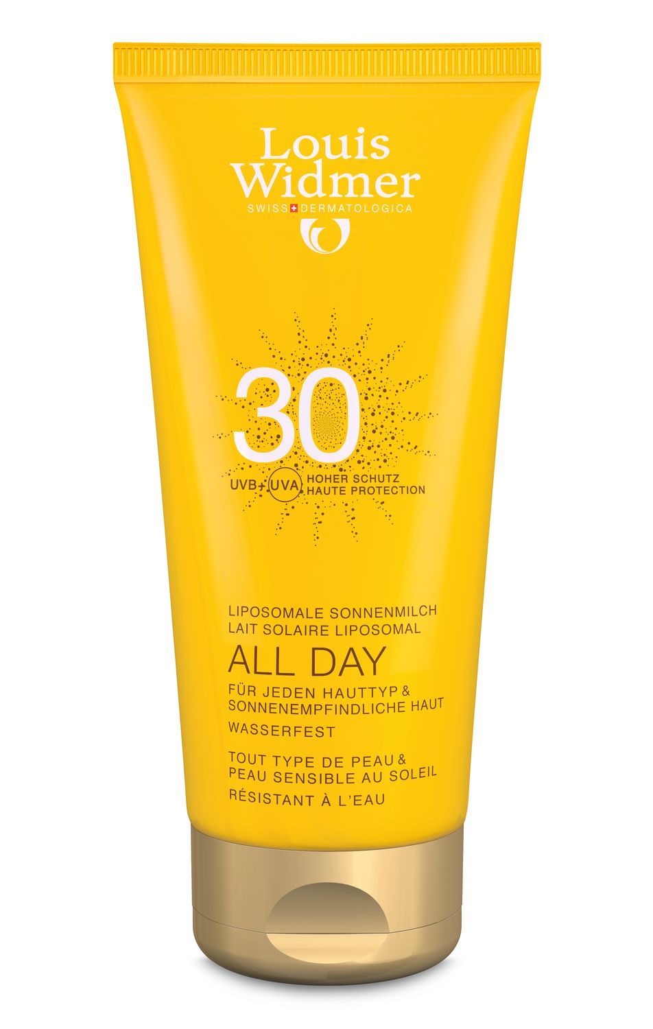 Dank hoch entwickelter Liposomen-Technologie ist es möglich, UVA- und UVB-Filter in die Monolayer-Liposomen einzuarbeiten. Diese Liposomen dringen tief in die Hornschicht ein und bieten deshalb einen lang andauernden Schutz vor UV-Strahlen, auch bei regelmässigem Wasserkontakt. Durch die hohe Konzentration an Monolayer-Liposomen ist eine homogene Verteilung der UV-Filter in der gesamten Hornschicht gewährleistet. Die Gel-Grundlage enthält zusätzlich UVA- und UVB-Filter. All Day 30 gewährt einen hohen Schutz vor UVA- und UVB-Strahlen. All Day 30 pflegt und befeuchtet die Haut. Es wird auch von der sehr empfindlichen Haut gut vertragen. Vitamin E schützt vor der schädlichen Wirkung freier Radikale und reduziert durch UV-Strahlung bedingte frühzeitige Hautalterung und Hautschäden. Es stimuliert die hauteigenen Repair-Mechanismen. Panthenol verbessert das Feuchthaltevermögen der Haut und wirkt normalisierend.